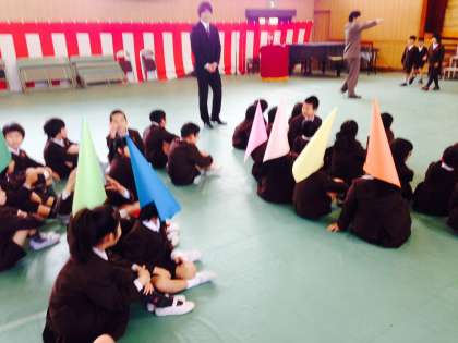 クラス分けでは色つき帽子をかぶって、1組・2組に分かれました。