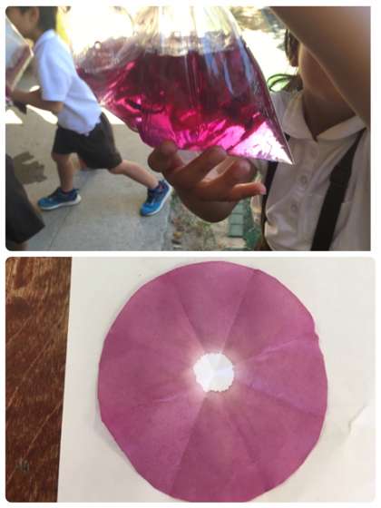 夏休みに集めていただいていたあさがおの花で、色水あそびをしました。