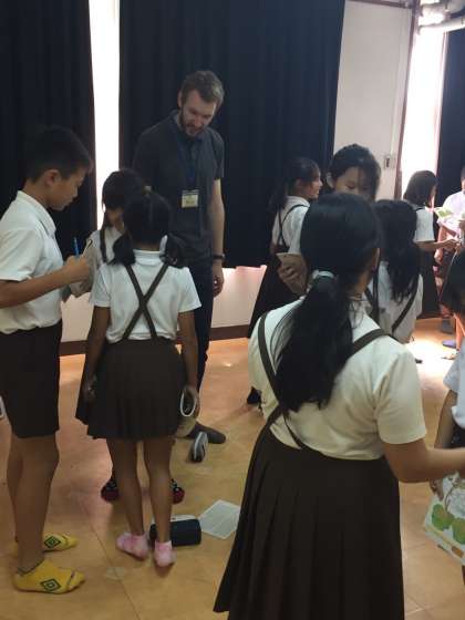 先生の発音を真似ながら、質問の答えを伝えて頑張っていました。
