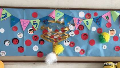 運動会を盛り上げるかわいい顔の玉が、いっぱい並んでいます。