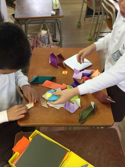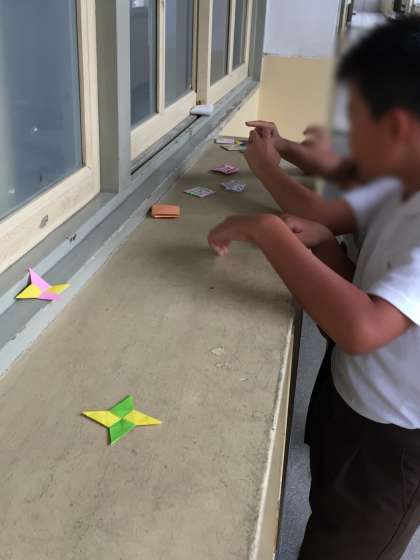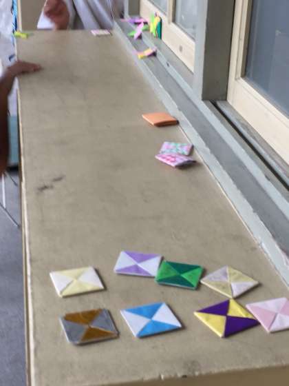 4年で休み時間、はやっている遊びは、色紙でおって作ったメンコの遊びです。