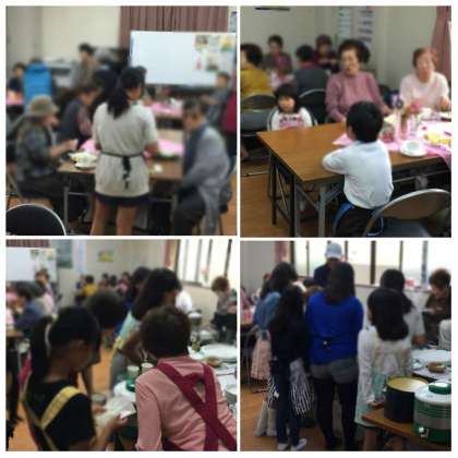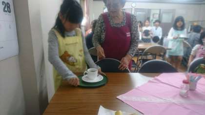 6年生から下の学年の子に仕事を教え、1年生の子どもたちも、はじめは地域の方とのお話をする担当でしたが、最後は水を運んだり、下げたりもすることができるうになりました。