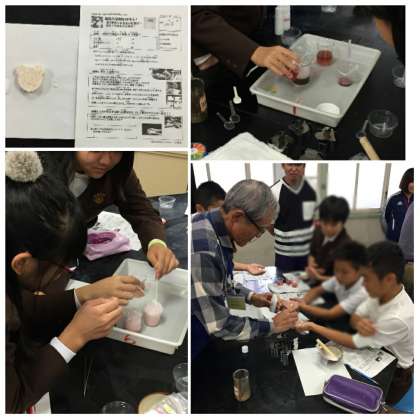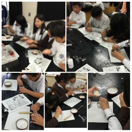 実験で発砲入浴剤づくりをしました。材料の薬品を覚えて、手順よく作りました。今夜、作った入浴剤を入れて、お風呂にはいるといっている子がたくさんいました。