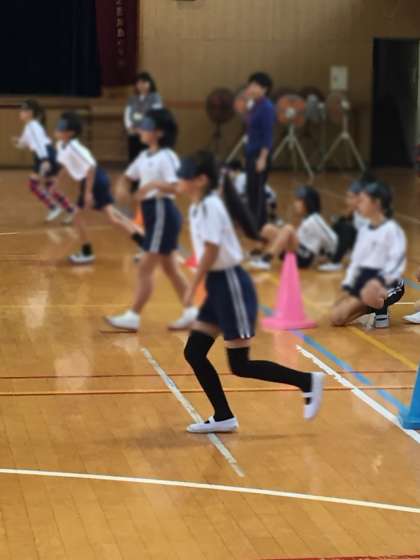 写真は、アイマスクをつけ、サポートの合図を聞いて、腕を前に出して走る体験をしています。
