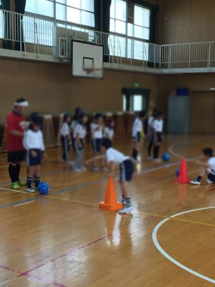 アイマスクをして、ボールを蹴り、コーンに当てます。