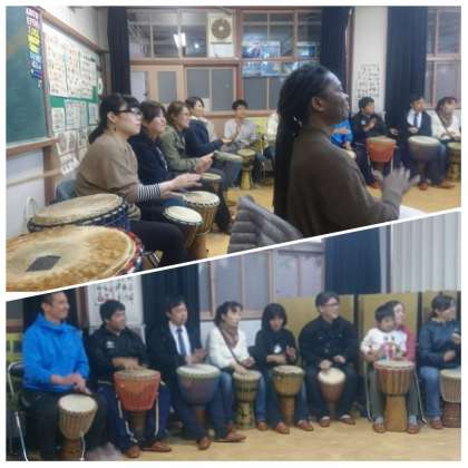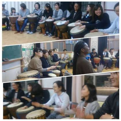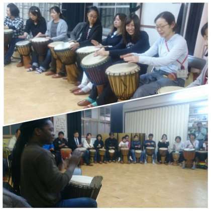 ジェンべ(アフリカの楽器)の体験をしました。楽譜のないなかで、リズムを感じながら、太鼓をならしていく楽しさを体験しました。