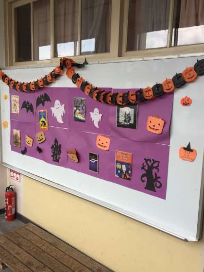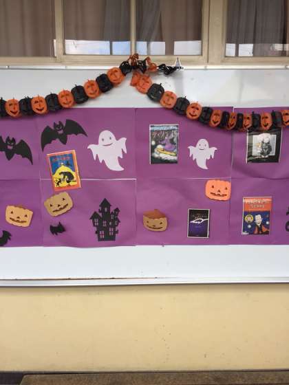 ハロウィーンにちなんで、図書室前では、お化けに関する本を紹介しています。