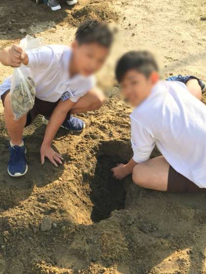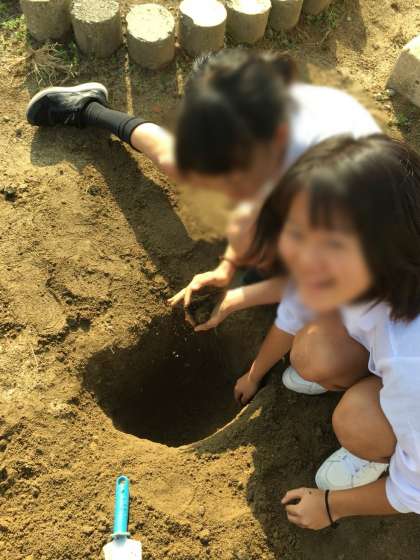 今日は、地面を掘って、砂や泥やなど、地層にわかれていることを発見していました。