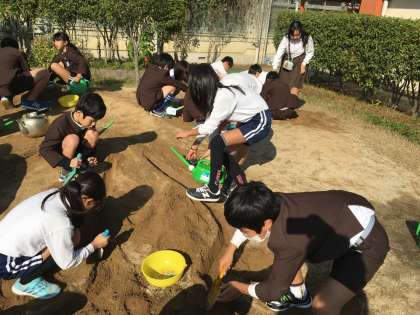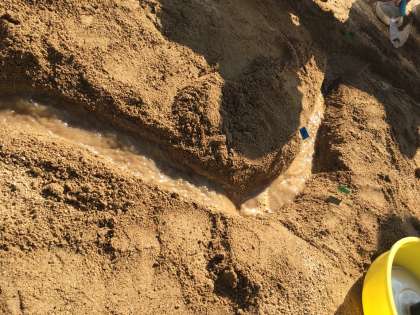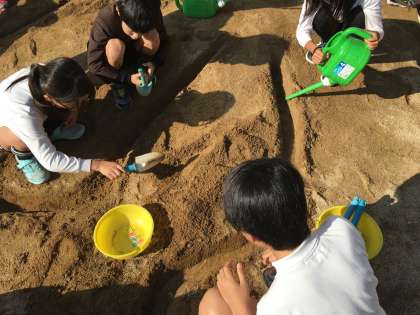 金曜日、5年生は「流れる水のはたらき」の勉強で、川の流れを観察する実験をしました。川作りから子どもたちはわくわくです。そして、山頂から水を流し、様子を観察しました。川の内側と外側では、流れや削れ方ににどのような違いがあるのか。流れに運ばれるものにはどのようなものがあるのか。実験のあとは、作った川を埋め立てて終了です。