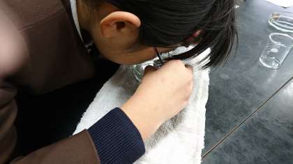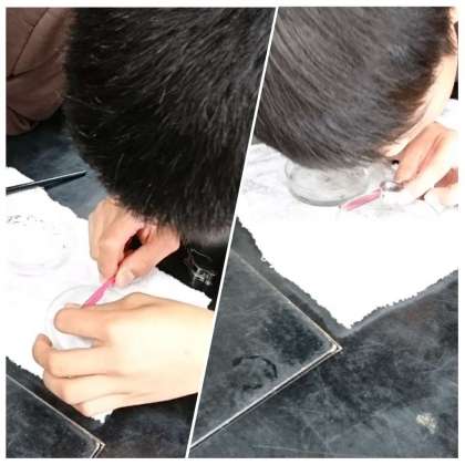プラナリアの生体をルーペで観察し、筆にのせてシャーレの上に移動させ、カミソリで切り、またその生体の状況をルーペで観察しました。
