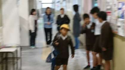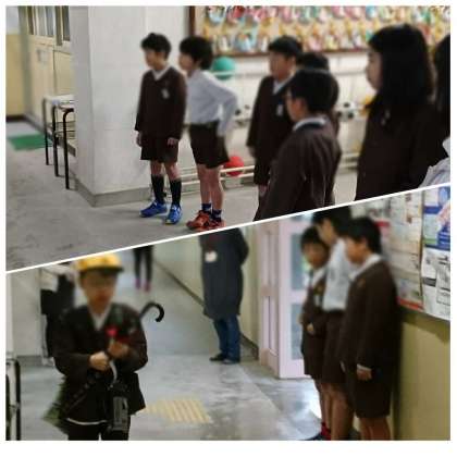 朝から少し雨がぱらついていたので、入り口廊下で挨拶をしました。