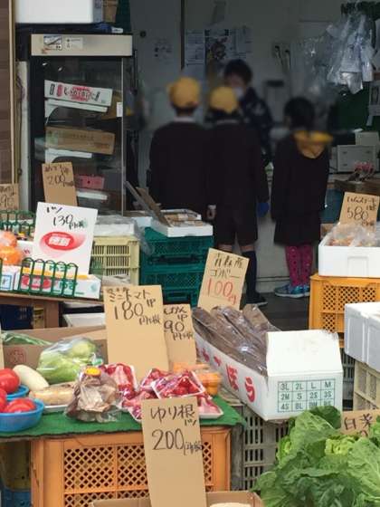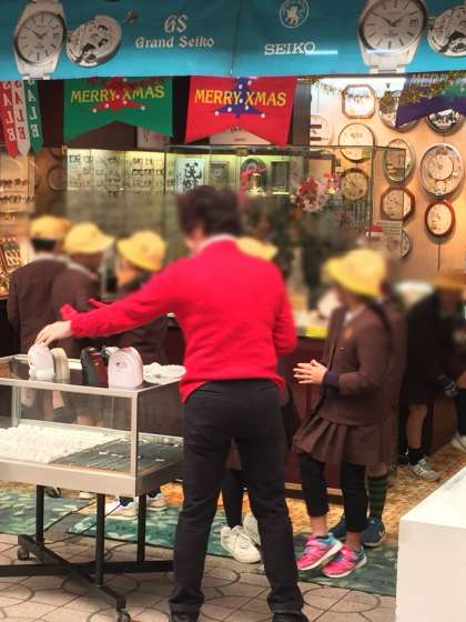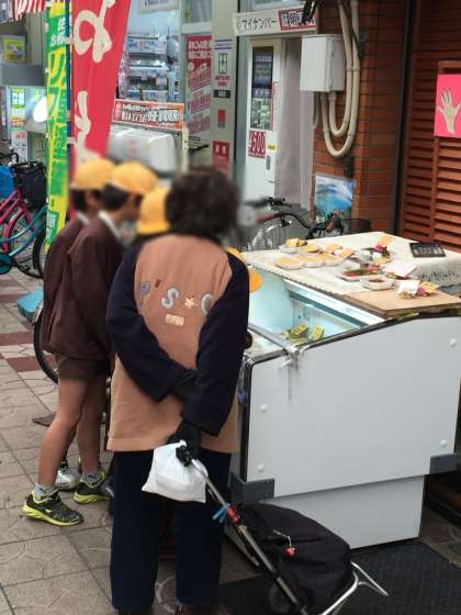 社会科の学習で、泉尾商店街の店をグループで見学しているようすです。