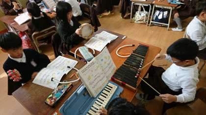 「子犬のマーチ」の演奏をしています。鍵盤ハーモニカ、木琴、タンブリン、鈴など、いろんな楽器の演奏を交代で楽しんでいます。