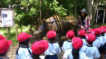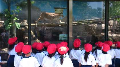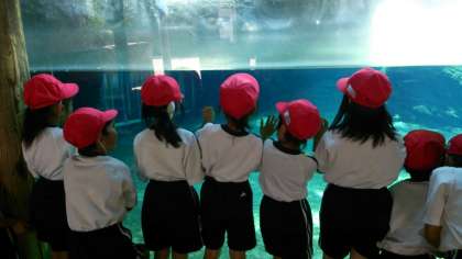 たくさんの動物に興味津々。みんな仲良く並んで見学しています。一人一人お気に入りの動物を見つけます。図画工作の時間に、その動物の絵を描きます。
