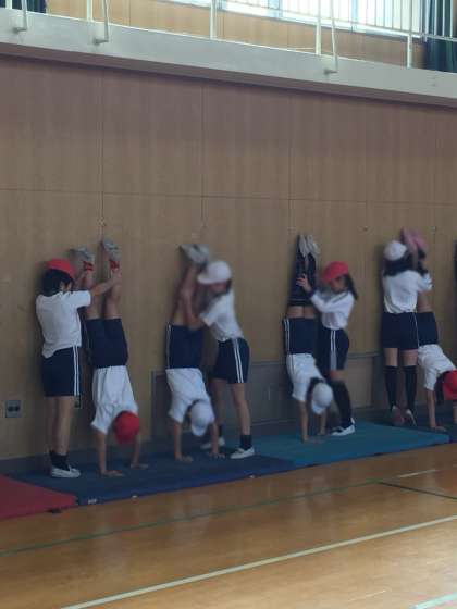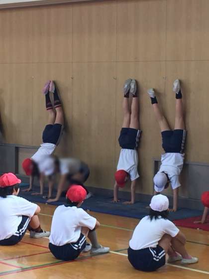 壁に向かって、倒立をし、感覚をつかんだところで、相手の子が補助をしています。