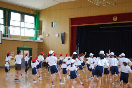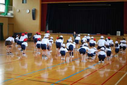 5月19日(月)3時間目、6年2組と1年2組の合同体力テストでした。まず、初めに体操をしました。6年2組の体操は、毎回ディズニーの曲に合わせて行います。今日は1年生も一緒にしました。