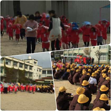一時避難では、身を守って揺れがおさまるのを待ち、運動場へ避難しました。