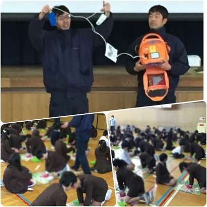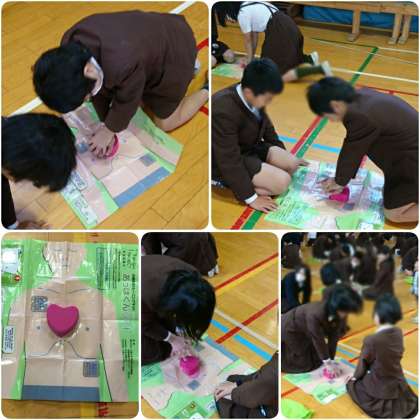 避難訓練のあとの時間は、大正消防署の方に、5・6年対象の救命入門講習をしていただきました。