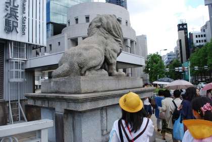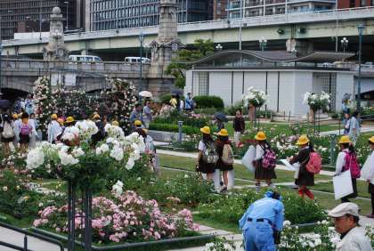 帰りは中之島バラ園で花を鑑賞しながら帰りました。駅前の難波橋(ライオン橋)にも驚きの様子でした。