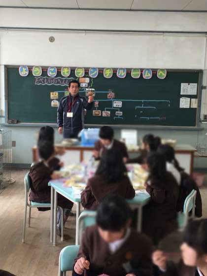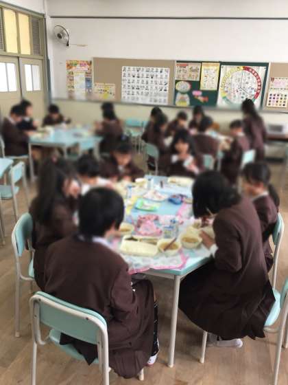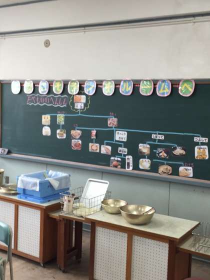 今日は、4年2組が栄養教育の学習をしました。テーマは、「食べ物の変身」。大豆がいろいろなものに、発酵や加工をすることにより、形を変えた食べ物になっていることを学びました。
