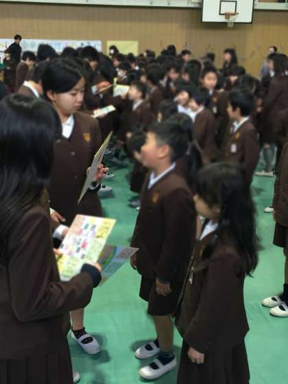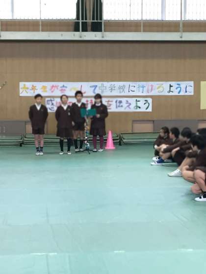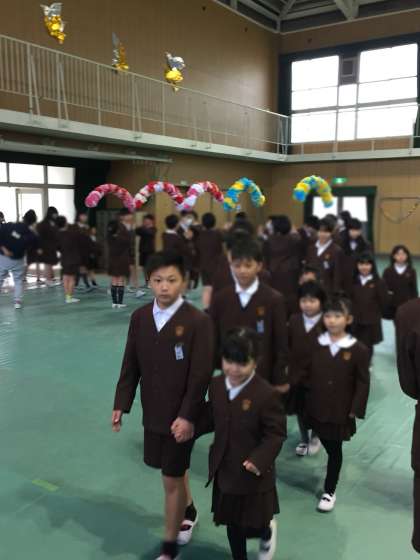 1〜5年生から、歌や言葉でお祝いの気持ちを表しました。