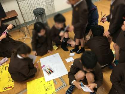 生活科の昔遊びの学習で、ぱっちんガエルや紙相撲、ブーメランやめんこなどの作り方と遊び方を考え、紹介する学習を行いました。
