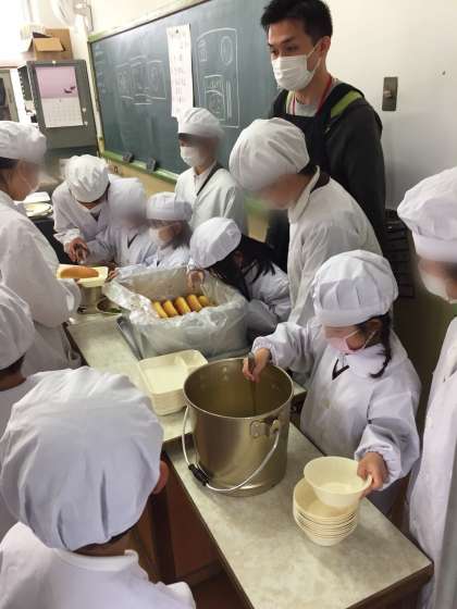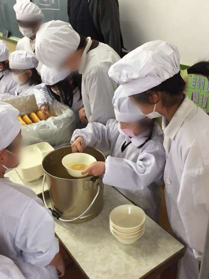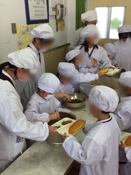 6年生に教えてもらいながら、一年生が給食を食器にいれて準備をすることが、少しずつできるようになってきました。