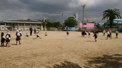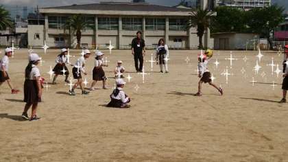 ドッジボールで、力いっぱいボールを投げ合いました。