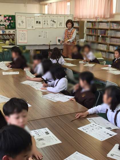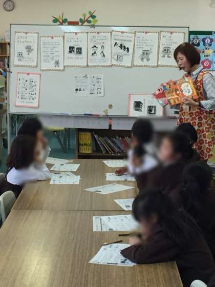 2年生は、図書館で図書館補助員の先生に、本のみつけ方や図書館でのルールを教えていただきました。また、図書館にある本の紹介もしてもらいました。