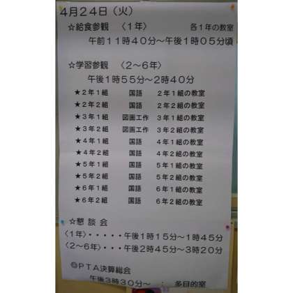本日、参観、懇談会、PTA決算総会です