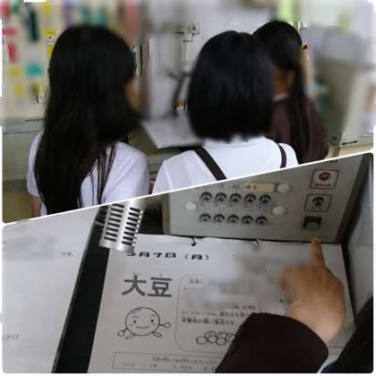 給食の時間の活動のひとつ、みんなへの放送を行っています。