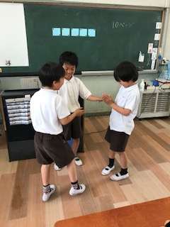 音楽時間に、2拍子の曲に合わせてリズム打ちの練習をしました。その毎に、リズム打ちを工夫して発表しました。協力して楽しく打つことができました。