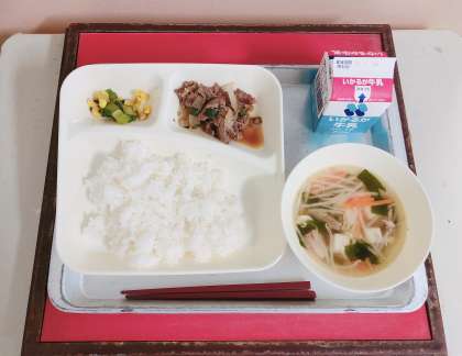 【プルコギ、とうふのスープ、チンゲンサイとコーンの甘酢あえ、ごはん、牛乳】