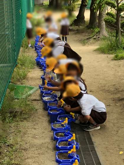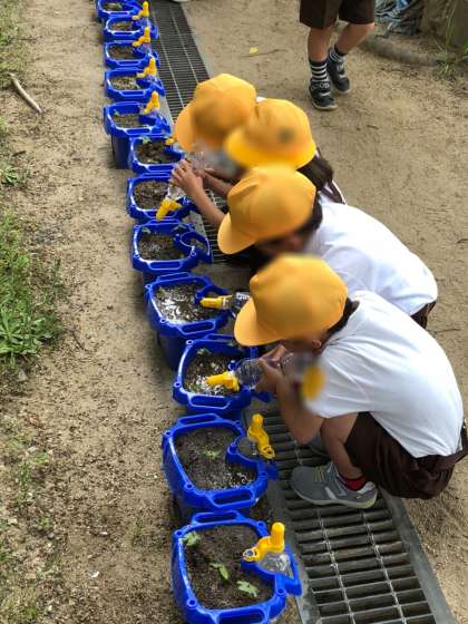 児童朝会のあと、それぞれの鉢に、水をやりました。