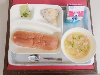 【かつおのガーリックマヨネーズ焼き、スープ、レタスのサラダ、おさつパン、牛乳】