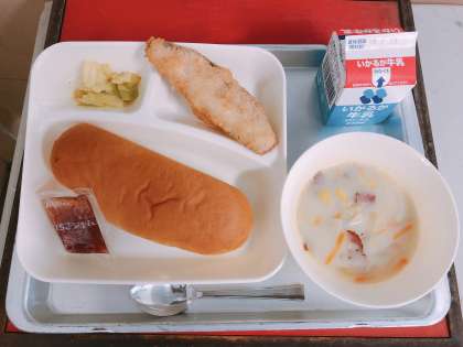 【サーモンフライ、豆乳コーンスープ、キャベツのカレーソテー、コッペパン、いちごジャム、牛乳】