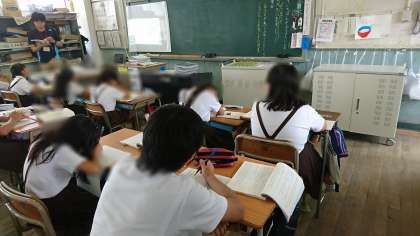国語の教科書を開いて、模範の音読を聞いています。その後、内容をイメージして、音読をします。