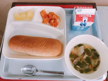 【えびのチリソース、中華スープ、りんご(缶)、ライ麦パン、牛乳】