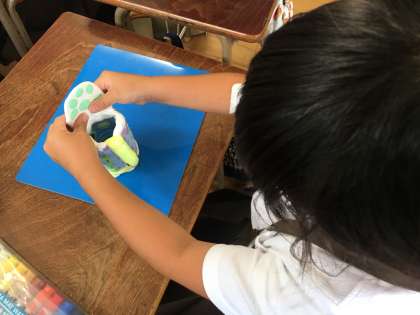 小さく粘土を丸めて顔を作ったり、色とりどりにしたりと思い思いの作品に仕上げることができました。