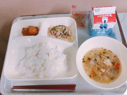 【ゴーヤチャンプルー、すまし汁、あつあげのみそだれかけ、ごはん、牛乳】