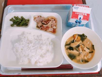 【豚肉とピーマンのしょうが焼き、かぼちゃのみそ汁、三度豆のごまあえ、ごはん、牛乳】