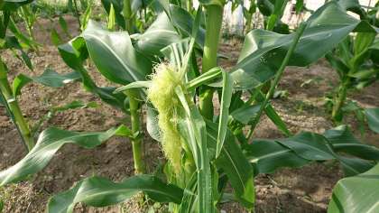 トウモロコシの実が膨らんできています。受粉がうまくできているようです。