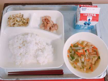 【鶏肉のしょうゆマヨネーズ焼き、五目汁、切り干しだいこんのゆずの香あえ、ごはん、牛乳】