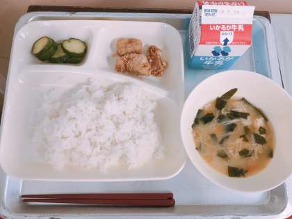 【豚肉の香味あげ、みそ汁、きゅうりの甘酢づけ、ごはん、牛乳】