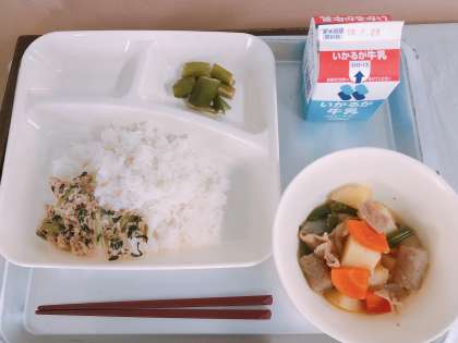 【豚肉とじゃがいもの煮もの、オクラの梅風味、ツナっ葉いため、ごはん、牛乳】