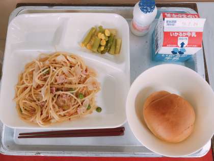 【シーフードトマトスパゲッティ、グリーンアスパラガスとコーンのサラダ、はっ酵乳、黒糖パン1/2、牛乳】