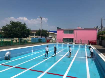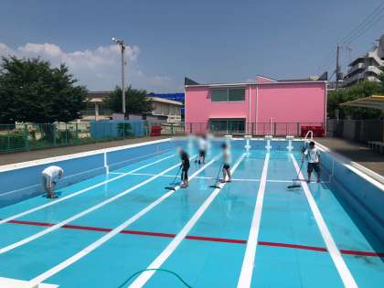 来週からのプール開放に向けて、きれいで、こどもたちが気持ちよくプールに入れるように…と、暑い中、清掃を行いました。