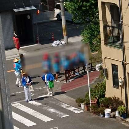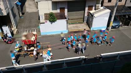 太鼓の申し込みをした児童が、太鼓をたたいたり、神輿を引いたり、しています。