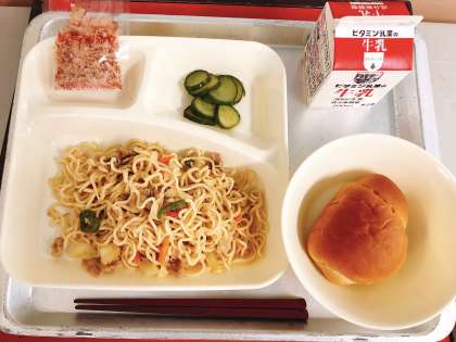 【和風焼きそば、きゅうりのゆず風味、黒糖パン1/2、牛乳】