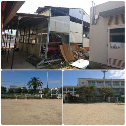 学校の再開を1日でもはやくできるようにするために、教職員で状況確認と片付けを行いました。